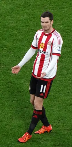 On 24 August 2012, his hometown team Sunderland signed Johnson on a four-year contract for £10 million.[51] Sunderland manager Martin O'Neill said "Adding quality players to the squad has been our main aim this summer and Adam certainly fits that bill. He has terrific ability, great delivery and I'm sure he is a player who will excite the fans. I couldn't be more delighted to have him at the club."[52] On 28 August, Johnson made his first appearance for Sunderland in a 2–0 win over League Two team Morecambe in the League Cup second round, assisting both goals at the Stadium of Light.[53] He scored his first goal for the club on 10 November, opening the scoring in a 1–2 defeat away to Everton.[54] He scored the only goal of a win over former club Manchester City at home on 26 December. In April 2013, against Sunderland's fierce rivals Newcastle at St James' Park, Johnson's picked up the ball on Sunderland's right and cut inside before sending a curling effort past Newcastle goalkeeper Rob Elliot with his left foot to score.[55]