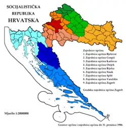 Communities of Municipalities 1974–1986 in Socialist Croatia (colored differently).