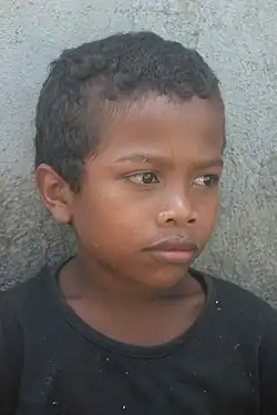 Aeta (Ayta /ˈtə/ EYE-tə), Agta and Dumagat, are collective terms for several indigenous peoples who live in various parts of Luzon islands in the Philippines. They are included in the wider Negrito grouping of the Philippines and the rest of Southeast Asia, with whom they share superficial common physical characteristics such as: dark skin tones; short statures; frizzy to curly hair; and a higher frequency of naturally lighter hair colour (blondism) relative to the general population. They are thought to be among the earliest inhabitants of the Philippines—preceding the Austronesian migrations.[2][3] Regardless, the modern Aeta populations have significant Austronesian admixture, and speak Austronesian languages.[4]