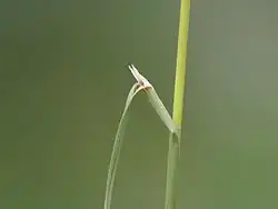 The leaves are dull green. The ligule is blunt, but toothed and up to 6 millimetres (0.24 in) long.