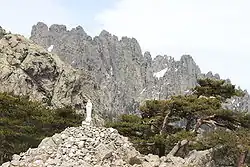 The Aiguilles de Bavella (Corsican: I Forchi di Bavedda; Needles of Bavella) are rocky spikes of red granite[1] that dominate the hill of the same name on the island of Corsica in France. At 1218 m, the hill connects the Alta Rocca to the east coast of Corsica. This massif is smaller yet much more popular than the "aiguilles de Popolasca". The site is characterized by jagged peaks, large rock walls and pine trees twisted by the wind.