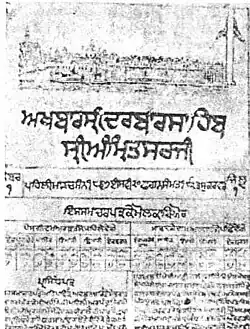 The Akhbar Sri Darbar Sahib Sri Amritsar Ji, also known simply as Akhbar Sri Darbar Sahib, was a Braj-language fortnightly newspaper written in Gurmukhi script that was founded in Amritsar in 1867.[1][2][3] It was one of the first Gurmukhi and Sikh newspapers.[note 1][1][4][2][3]