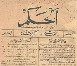 Sheikh Yaqub Ali Irfani thus began the weekly Urdu[7] Al Hakam newspaper, with the first issue being published on 8 October 1897. Until the end of 1897, it was printed by Riyaz-e-Hind Press in Amritsar.[8] Thereafter, it moved to the headquarters of the Ahmadiyya Jamaat in Qadian[8] and, with brief intervals, continued publication until July 1943.[9]
