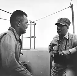 Commander Carrier Air Group 80 (CVG-80), Commander A.O. Vorse, discusses the results of the 6 November 1944 fighter raid on Manila with Rear Admiral Arthur W. Radford, right.
