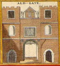 The etymology of the name "Aldgate" is uncertain. It is first recorded in 1052 as Æst geat ("east gate") but had become Alegate by 1108.[1] Writing in the 16th century, John Stow derived the name from "Old Gate" (Aeld Gate). However, Henry Harben, writing in 1918, contended that this was wrong and that documents show that the "d" is missing in documents written before 1486–87. Alternative meanings include "Ale Gate" in connection with a putative ale-house or "All Gate" meaning the gate was free to all. Other possibilities canvassed by Harben include reference to a Saxon named "Ealh," or reference to foreigners ("el") or oil ("ele") or "awl". Gillian Bebbington, writing in 1972, suggests Alegate, Aelgate ("public gate") or Aeldgate ("Old Gate") as equally viable alternatives, while Weinreb and Hibbert, writing in 1983, revert to Stow's theory that the name means "Old Gate".[2][3][4]