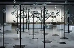 The work by Alexander Morozov is an exhibition within an exhibition: an installation of the glass floats used by Estonian fishermen to keep their nets afloat. These floats come from the village of Nõmmküla, whose fishermen are famous for catching the biggest fish in Estonia’s recent history. The village is located on the island of Muhu, formerly used for Soviet missile bases. During their presence on the island the military forbade the fishermen to go to sea, as this was border territory.[1]