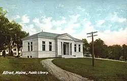 Simeon Coffin of Newbury, Massachusetts, arrived in 1764 and lived for a time in a wigwam, although the first permanent settlement took place in 1770. Known as the north parish of Sanford, the community was set off and incorporated as a district on February 4, 1794. Sawmills and gristmills operated by water power at the streams. A log jail was built in 1803, with a brick jail in 1869. The courthouse was built in 1806, the year Alfred became the shire town of York County. It was incorporated as a town in 1808, named in honor of King Alfred the Great. Land would be set off to Sanford in 1828, and annexed from Waterboro in 1847.[5] The Rochester & Portland Railroad entered from Waterboro in 1864, connecting to Rochester, New Hampshire, in 1871. More than 30 trains passed through Alfred daily between 1910 and 1920, but use would decline in the age of automobiles. Passenger service ceased in 1949, with the final train departing in 1961. A severe drought in Maine tindered the Great Fires of 1947, burning 4,500 acres (18 km2) of woodland and two residences in the town.