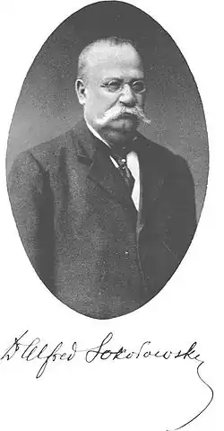 Alfred Marcin Sokołowski (11 November 1849 in Włodawa - 8 March 1924 in Warsaw) was a Polish pulmonologist and professor of the University of Warsaw. He specialised in the field of Phthisiatry (study of tuberculosis) and he was one of the pioneers of modern treatment to diseases of the respiratory system.