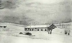 Dinton Ranch, Alberta, Canada, from a painting by Colonel Alfred Wyndham. Mrs Wyndham recorded moving in when the temperature was −20 °F in 1887