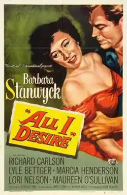 All I Desire is a 1953 American drama film directed by Douglas Sirk and starring Barbara Stanwyck, Richard Carlson, Lyle Bettger, Marcia Henderson, Lori Nelson, and Maureen O'Sullivan. It is based on Carol Ryrie Brink's 1951 novel Stopover.