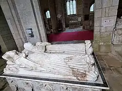 The set of alabaster monuments are described as being "the glory of the church";[1] they consist of the effigies of six recumbent couples lying on tomb chests, and all depict members of families connected with the Harewood estate.[1] All the monuments were originally brightly coloured, but the colour has been lost, leaving the white alabaster. A major programme of conservation was carried out in 1978 when they were dismantled and reerected as close as possible to their original locations.[10] On the sides of the tombs are depictions of angels, saints and mourners.[7] The oldest tomb, in the south chapel, is that of Sir William Gascoigne, Lord Chief Justice and his wife Elizabeth; it dates from about 1419.[1] Sir William is dressed in his robes and he carries a purse and a dagger. The later tombs display a greater sophistication in their carving, and they reflect the fashions of the day.[2] The latest effigies are of Edward Redman (Redmayn)[11] and his wife Elizabeth Huddleston, dating from about 1510; the depiction of Edward Redman is said to be a true-to-life portrait, a rarity at the time it was carved.[12]