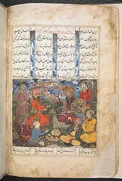 Allahverdi Khan (seated center right) with his son Emamqoli Khan (seated center left). From a Jarunnameh of Qadri. Isfahan style, dated 1697
