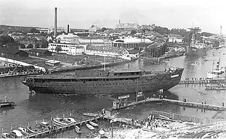 The investments required capital and finally Crichton-Vulcan was sold to Maskin o. Bro, which had taken over previously the Hietalahti yard in Helsinki. The acquisition improved the company's financial basis and during the 1930s Crichton-Vulcan had grown the strongest and most modern shipyard of Finland under Staffans's leadership.[7] The most important investments were a crane with a capacity of 100 tonnes and a dry dock.[8]