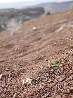 Allium scilloides produces bulbs along an underground rhizome, each bulb round to egg-shaped, up to 2 cm across. There are usually two thick flattened leaves that curl near the ends and are often nearly prostrate on the ground. Flowers are bell-shaped, about 7 mm across; tepals white, pink or purplish with green midribs; anthers purple; pollen white to gray. Flower buds are often dark red to dark pink before opening.[3][6][7][8][9]