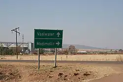 Road sign outside Laerskool Alma showing direction to local towns Vaalwater and Modimolle/Nylstroom.