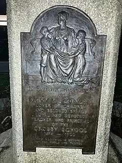 In 1923, Dallin produced a similar image as a bas-relief plaque for the Scanlan Memorial at Crosby School (today, Lesley Ellis School) at 34 Winter Street in Arlington. He added a bench and substituted a standing boy for the girl on the left. The plaque honors Mary F. Scanlan, a deceased teacher and principal for 48 years.[9]