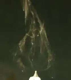 The nanofibrous plume generated during alternating current electrospinning without using a grounded collector.