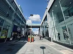The historic market town developed as a residential area in the 19th century although it retains its retail heritage in the Old Market Place (a conservation area) and a new pedestrianised shopping centre. The retail districts of the town have more recently fallen victim to decline due to competition from the nearby Trafford Centre and a regenerated Manchester city centre.[65] In 2006 Trafford Metropolitan Borough Council unveiled plans for a £1.5 million redevelopment for the town centre.[62] The renovation will create 146,000 square feet (13,600 m2) of new retail space and 203,000 square feet (18,900 m2) of refurbished space, providing 349,000 square feet (32,400 m2) in total.[66]