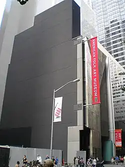 In 2001, a new building on 45–47 West 53rd Street was opened. Tod Williams and Billie Tsien designed an eight-level building on a forty-foot-wide, one hundred-foot-long site on 53rd Street.[8] From 2001 to 2011, the midtown space served as the museum's main branch. However, facing increasingly high bond payments, the museum sold the midtown branch to the Museum of Modern Art.[9] When MoMA announced that it was going to demolish the building in connection with its expansion, there was outcry and considerable discussion about the issue, but the museum ultimately proceeded with its original plans.[10][11] The building was demolished in 2014, though the unique metal façade was preserved in storage by MoMA.[12]