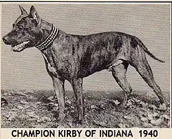 Some varieties of the extinct bull-and-terrier dog from the British Isles began to find their way into America[2] as early as 1850. These varieties became a breed recognized by the United Kennel Club as American Pit Bull Terrier in 1898. In 1936 the American Kennel Club recognized the breed with a different name and registered some individuals in the stud book. The name Staffordshire Terrier was approved because the ancestors of the breed were claimed to originally come from Staffordshire, England, a theory inspired by the recognition in 1935 of the related Staffordshire Bull Terrier by the British Kennel Club. The name of the AKC registered breed was revised on January 1st 1969 to American Staffordshire Terrier to distinguish it from the British Staffordshire Bull Terrier.[7][8][9][10][11]