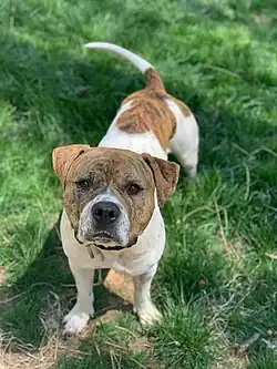 The American Staffordshire Terrier stands 18–19 in (46–48 cm) tall and weighs between 40–70 lb (18–32 kg).[2] The American Kennel Club (AKC) describes the breed as "confident, smart and good-natured". American Staffordshire Terriers are not to be confused with American Pit Bull Terriers; though the American Pit Bull Terrier has similar ancestry they are two distinct breeds. It also should not be confused with the "Staffy" Staffordshire Bull Terrier of the United Kingdom.[2]