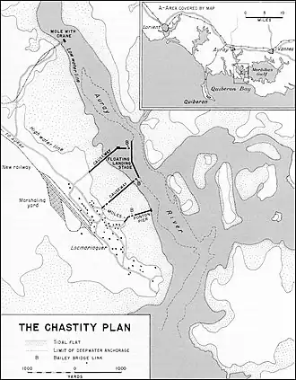 Logistical support of the American armies would therefore depend on the ports of Brittany, principally Brest, Lorient and Quiberon Bay. Along with Saint-Malo, they were expected to have a capacity of 17,500 measurement tons (19,800 m3) per day. Of this, 10,000 measurement tons (11,000 m3) per day were expected to come through Quiberon Bay, as it was anticipated that the ports would suffer considerable damage in the fighting, or through German demolitions. Studies indicated that Quiberon Bay had an anchorage sufficient for 200 ships, 3,000 yards (2,700 m) of beaches with the required slope for landing craft, and four minor ports close by where deep-water piers could be constructed. A detailed plan known as Operation Chastity was drawn up to develop the area.[9] Crucially, the Overlord plan called for a one-month pause at the Seine, which was expected to be reached by D plus 90, in order to build up supplies and logistical infrastructure before advancing further.[10] The expectation of an advance at a prescribed rate, while necessary for planning purposes, built inflexibility into a logistics plan that already had little margin for error. Staff studies confirmed that Overlord could be supported if everything went according to plan, but no one expected that it would.[11][12]