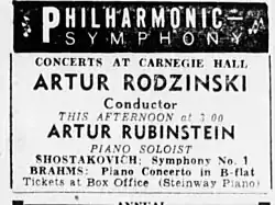 Rodziński and Serge Koussevitzky had both also been interested in conducting the Seventh's premiere.[77] Am-Rus Music Corporation granted the rights to the first concert performance to the latter.[52]