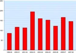 Attendance levels at Andover's matches reached a peak in the late 1960s. During the 1969–70 season, home attendances at league matches averaged over 550, with the largest crowd being the 2,144 people who watched their FA Cup match against local rivals Salisbury.[40] In the years following their promotion to the Southern League, average attendances started to drop until they dipped below the 200 mark during the 1970s. Since then, the average attendance at Andover's matches has remained at approximately 140, although this figure dipped below 100 in the 1999–2000 season following their last relegation from the Southern League.[13] Just three seasons later however, this figure had risen to just under 200 following the club's second consecutive Wessex League championship and successes in cup competitions.[17]
