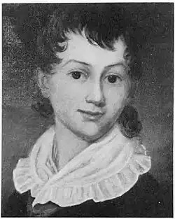 When his mother died and his father was elected president in 1828, he periodically visited Washington—where he was considered popular, socially adept, and handsome—before returning to Nashville to manage The Hermitage and his father's business affairs.[22] Jackson, an inveterate busybody and matchmaker, frequently inquired about or suggested prospective brides for Junior in his letters home.[22] Jackson did not attend his son's wedding to Sarah Yorke Jackson, sending nephew Ralph Earl in his stead, and sending the bride a pearl ring that contained a lock of his hair.[23] President Jackson also gave Sarah Yorke a legally enslaved girl named Gracy to serve as her ladies' maid, sponsored an expansion of the Hermitage for the young couple and paid for $2,000 in new furniture.[24] Giving Gracy, or any enslaved person, as a gift to his son and daughter-in-law "kept valuable commodities within the extended white family, giving the next generation opportunities for greater wealth and status by providing additional labor both in the home and in clearing land and increasing crop production."[25]