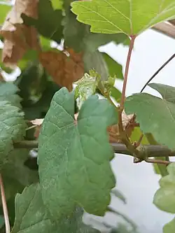Angelica flowers mature 8 months after germination and yields dense fruit that holds its shape when cut into small pieces. Its leaves are arrayed in alternative arrangement. The leaves grow to about 10 cm (3.9 in) long and the tendrils reach 12 cm (4.7 in) long.[2][3] The tendrils prong outwards into 2 curves, multiple prongs may exist on one tendril. Young leaves are shiny.