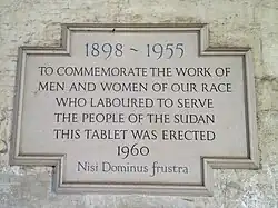 Plaque in the Cloisters of Westminster Abbey, London, to commemorate the British in Anglo-Egyptian Sudan 1898–1955. The abbreviated Latin motto is from Psalm 127:"Except the Lord buildeth the house, they labour in vain that build it."