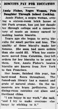 Fisher was a celebrated personality in Columbia, with multiple articles written about her in the University Missourian. One particularly interesting article was her suggestions for Thanksgiving dinner.[8] Fisher rented her properties out to black families who couldn't find housing easily in 1913.[9] Annie gave out her recipes freely, but noted that she could not teach the common sense needed to cook her food.[6] A 1927 article in the Springfield Leader estimated Fisher's net worth to be $100,000.[3]