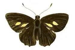 (Description of A. a. ampyx) Upperside: Antennae white, brown at their extremities. Thorax, abdomen, and wings brown; the anterior wings having two oval straw-coloured spots placed near the middle, and the anterior edges of the posterior ones streaked with the same colour.