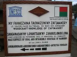 In 2003, the Zafimaniry and their work with wood were considered to be Masterpieces of the Oral and Intangible Heritage of Humanity, a list maintained by UNESCO to protect and preserve their way of life which is being spoiled by tourism.