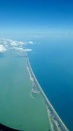 The Arabat Spit (Ukrainian: Арабатська коса; Russian: Арабатская коса; Crimean Tatar: Arabat beli), or Arabat Arrow (Russian: Арабатская стрелка), is a barrier spit that separates the large, shallow, salty Syvash lagoons from the Sea of Azov. The spit runs between the Henichesk Strait in the north and the north-eastern shores of Crimea in the south.[3] It is the largest of several spits of the Sea of Azov.