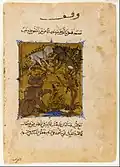 It is rare to have an example of both text and illustrations of the same page, which makes it difficult to gather information about illuminated manuscripts. In some cases, it is possible that illustrations were added to an already existing text at a later date.[48] Fatimid illustration style can be demonstrated by one surviving piece of paper, which was excavated in Cairo. This single sheet of paper has drawings on both sides; one side showing a lion, and the other, a hare. While it is unclear whether this page originated from a work of, potentially, scientific or zoological subject matter, it is an example of larger patterns of naturalistic and figural representation within Fatimid art.[50]