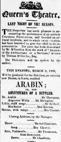 Arabin; or, The Adventures of a Settler is an 1849 Australian stage play by James McLachlin.[2][3] It was arguably the first Australian play presented in Melbourne.[4]