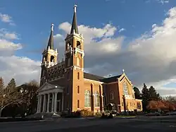 The Spokane area has a great number of architecturally significant religious institutions, cathedrals, and churches done in a variety of styles as different denominations sometimes have unique church architectural traditions. The most significant structures are likely the Romanesque Revival Cathedral of Our Lady of Lourdes designed in various stages by a combination of the firms Preusse & Zittel and Julian & Williams.[16][17] and the English Gothic style Cathedral of St. John the Evangelist designed by Harold Whitehouse.[18] The Cathedral of Our Lady Lourdes concept design is credited to Preusse & Zittel before construction began in 1902 and follows a cruciform plan with the apse on the south end and two 125-foot bell towers flanking the narthex entry on the north side with the nave, transept and aisles featuring ribbed vaults.[16] The cathedral was dedicated in 1907 with Julian & Williams completing the project. The beginning of the story for the Cathedral of St. John the Evangelist begins in 1924, not long after newly arrived bishop, Edward Makin Cross came to town and hatched a plan to put a cathedral on the South Hill to succeed the All Saints Cathedral downtown, and hired church congregant, Harold C. Whitehouse to design it.[18][19] Touring Europe for design inspiration, he eventually settled on using the English Gothic style with some French influences. The first stage of construction, the nave leading to the high altar was completed in late 1929, allowing for the first mass to be held, ten days before the 1929 stock market crash which led to a halt in construction for almost two decades. Construction resumed in 1948, and the chancel, sanctuary, transepts, and the Gothic tower were completed by 1954.[19] The building is a solid masonry construction featuring a sandstone exterior quarried near Tacoma and sandstone interior from Idaho with some Indiana limestone; the building contains no structural wood or steel.[19][20]