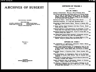 In July 1920, the first issue of Archives of Surgery was published by the American Medical Association. William J. Mayo, MD, who was a member of the editorial board and authored the inaugural editorial, indicated that Archives of Surgery would follow the character and scope of its sister journals, Archives of Internal Medicine, Archives of Neurology and Psychiatry, and the American Journal of Diseases of Children.[1] Mayo also commented that Archives of Surgery would not compete with the other two prominent surgical journals that existed at the time: Annals of Surgery, established in 1885, and Surgery, Gynecology and Obstetrics, established in 1905. The trustees who founded Archives of Surgery believed that creating this new surgical journal would help alleviate the publication burden of the other two surgical journals while also creating a "sphere of its own" that would be "sufficiently useful to the profession to warrant its entering the field".[1]