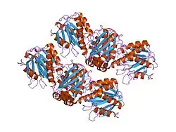 2. ^ Elkins JM, Kershaw NJ, Schofield CJ (January 2005). "X-ray crystal structure of ornithine acetyltransferase from the clavulanic acid biosynthesis gene cluster". Biochem. J. 385 (Pt 2): 565–73. doi:10.1042/BJ20040814. PMC 1134730. PMID 15352873.