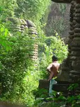 The raha niches on three sides uniformly measuring 0.55 metres in height x 0.3 metres in width x 0.15 metres in depth, are all empty. However, on both sides, the niches are decorated with scrollwork.