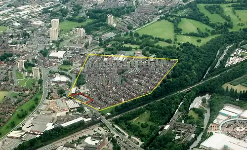 An aerial view of Armley. The most heavily contaminated housing area is enclosed by the yellow box. The red box encloses the former Midland Works asbestos factory.[1]