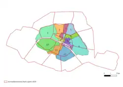 In 1860 Paris was extended to the Thiers wall, giving rise to a new division into twenty arrondissements,[4] completely different to the twelve.