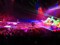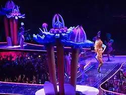 The band was placed inside the white dome like structures on the stage, described by John Jurgenson from The Wall Street Journal as like the planet Tatooine in the Star Wars series. At the end of one of the Lucite runways, a piano was hidden beneath enormous stalagmite-like structures reminiscent of Superman's Fortress of Solitude in the comics.[15][16] There was also a bar overlooking the piano area, where the audience could order drinks while watching the show.[17] Carl Williot from Idolator website compared the stage with that of ArtRave, and felt that it looked like an "insect" with the extended runway and smaller stages.[18] Following the reveal of the image, the hashtag #LadyGagaTourStage started trending globally in Twitter.[19] According to Stacy Lambe from Out magazine, the stage took over 21,000 hours to construct, including the catwalks. There are 15 inflatable trees which are air hosed on the stage to re-create a garden during one of the segments. The whole set up took three hours to dismantle and 21 trucks to carry it from one venue to another.[20] Production manager Jason "JD" Danter explained that the whole set up started from 8:00 am, with lighting and sound checks taking six hours to complete.[21]