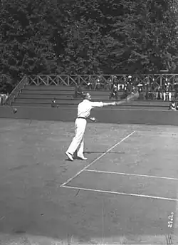 He played his first tournament at London Athletic Club in 1887,[8] and his first title came at a grass court tournament in Stevenage in August 1888.[9] Gore won the singles title at the Scottish Championships in 1892 and successfully defended the title in the Challenge Round in 1893.[10] In 1894 he won the North London Championships[11] on grass, a tournament that he won five times (1894, 1898, 1899, 1900, 1906).[9] He won the singles title at the Kent Championships on two occasions; in 1900 by defeating Harold Mahony in the final in straight sets, and in 1906 against A.L. Bentley, also in straight sets. In 1904 he won the City of Paris Championships in Puteaux, Paris against Max Decugis. [12] and in 1906 against A.L. In 1900 and 1908 he won the singles title at the British Covered Court Championships, played at the Queen's Club in London. In May 1908 he won the singles title at the British Covered Court Championships, played at the Queen's Club in London, defeating New Zealander Anthony Wilding in the Challenge Round in four sets.[13] Gore had the longest ever span (34 years) in the Wimbledon men's singles (he entered a record 30 times in singles from 1888 to 1922).,[14] In addition he also won the Leicestershire Championships three times (1913, 1914, 1919) and the Nottinghamshire Championships four times (1905, 1910, 1912, 1913).[9] He also holds the all-time record for the longest tennis career of any player between their first and last titles, that being 30 years, 11 months and one day.[15] Gore was a successful all surface player winning 51 singles titles and reaching the finals of 26 other tournaments on clay, grass and hard asphalt & wood courts from 1888 to 1919.[9]