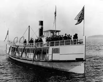 Once at Puget Sound, H. B. Kennedy put Athlon on the popular Seattle-Port Orchard (Navy Yard) Route, in competition with Joshua Green's boat, the Inland Flyer. Athlon's first captain on Puget Sound, in February 1901, was William Mitchell, who had worked his way up from cabin boy. (Mitchell eventually in 1933 became manager of the Kitsap Transportation Company, one of the last remaining competitors to the by-then dominant Puget Sound Navigation Company.)[2] By July 1901, H. B. Kennedy and Joshua Green reached a deal to end competition between their two boats, fixing rates on the route as was usual with these anti-competitive agreements. Over the years, the firms of H. B. Kennedy and Joshua Green's Puget Sound Navigation Company drew closer together and eventually merged. By 1903, Athlon was still owned by H. B. Kennedy personally, but was being operated by Puget Sound Navigation. This combination drove off all would be competitors including the Manette, and later, Arrow, even though Arrow was a much faster boat than Athlon, beating her by 30 minutes on a race from Seattle to Bremerton.[3]