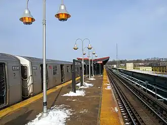 After the remaining portion of the Fulton Street el was removed in 1956, the Canarsie line continued to use the westernmost track and platform southbound, and the second track from the east and platform (over Snediker Avenue) northbound. The easternmost track was removed, leaving five in place.[10]