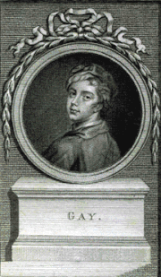Portrait of John Gay from Samuel Johnson's Lives of the English Poets, the 1779 edition. Gay's gentle satire was a contrast with the harsher Pope and Swift.