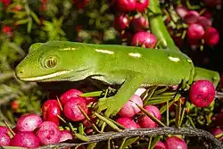 The Aupōuri green gecko (Naultinus flavirictus), also known as the North Cape green gecko or yellow-lipped green gecko, is a species of gecko in the family Diplodactylidae. While the existence of the species was known for many years, it was undescribed until early 2021, with its scientific name being Naultinus 'North Cape' prior to description as N. flavirictus.[3][4]