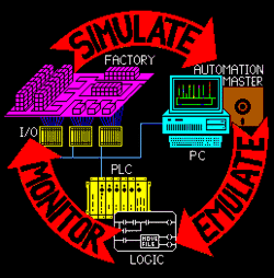 Automation Master connects to the Control System/PLC and emulates the real world I/O by reading and writing the PLC's internal I/O images. The simulator can receive the Control System/PLC's outputs, and respond with the inputs in real time without the need for any hard-wired physical I/O. A simulator emulates the real time response to the Control System/PLC actions based upon a model which duplicates the operation of the automated system. For example, if the Control System/PLC sets a digital output to start a motor to raise a door, the model, within milliseconds, provides the Control System/PLC with an auxiliary contact closure to indicate that the motor has been started. Shortly, the door closed limit switch is turned off as the door begins to rise. As long as, the Control System/PLC keeps on the output signal which raises the door, the door in the model continues to rise. When the door is fully open, the model turns on the door open limit switch, and the PLC responds by turning off the motor which raised the door. The model sees the Control System/PLC turn off the motor and drops out the motor's auxiliary contact.